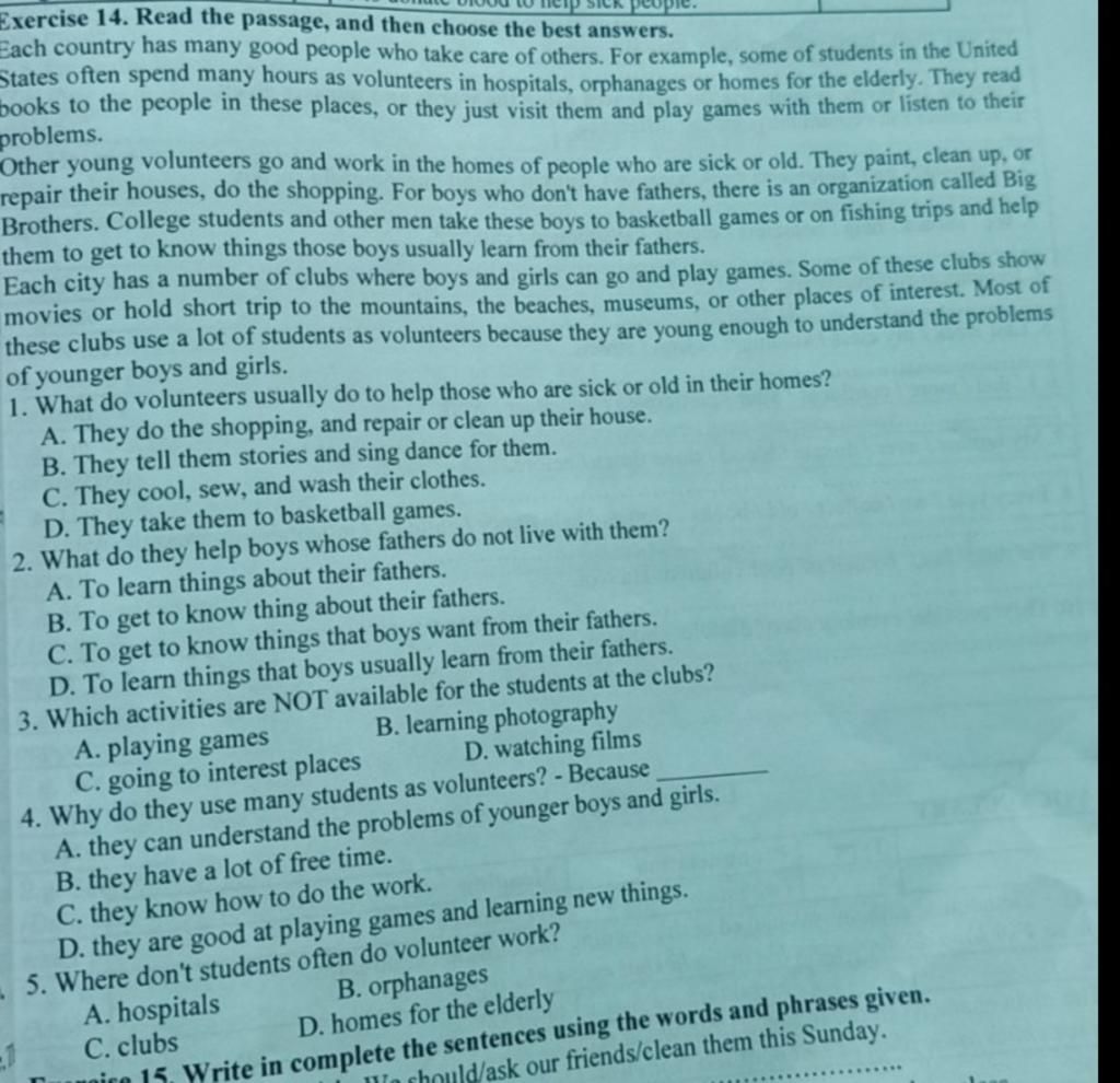 - dẫn chứng: Other young volunteers go and work in the homes of people who are sick or old. They paint, clean up, or repair houses, do the shopping