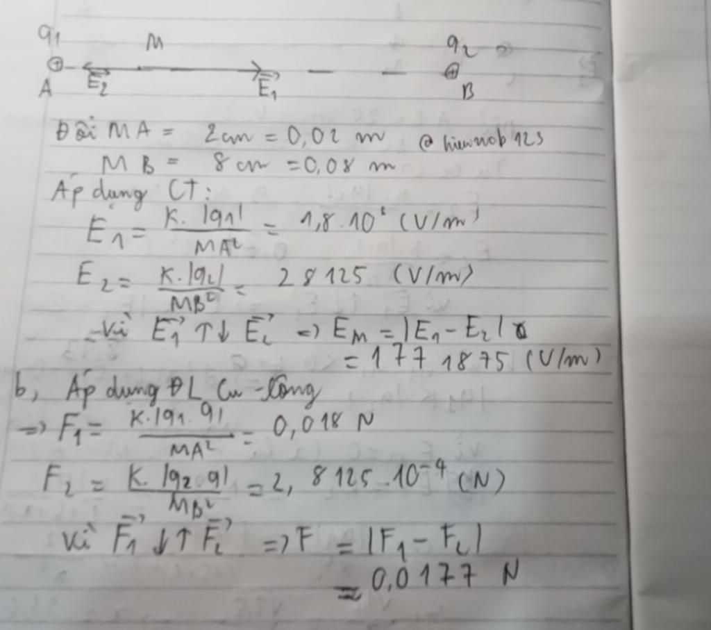 a) Cường độ điện trường do `q_{1}` tác dụng lên `M` là: