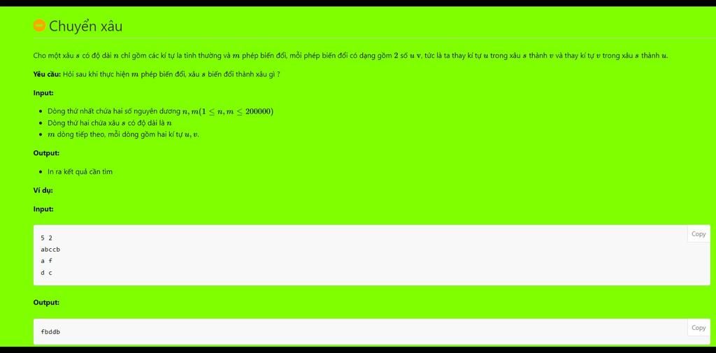 Cho một xâu s có độ dài n chỉ gồm các kí tự là tỉnh thường và m phép biến đổi, mỗi phép biến đổi có dạng gồm 2 số u v, tức là ta thay kí tự u trong xâu s thành ở và thay kí tự ở trong xâu s thành u.