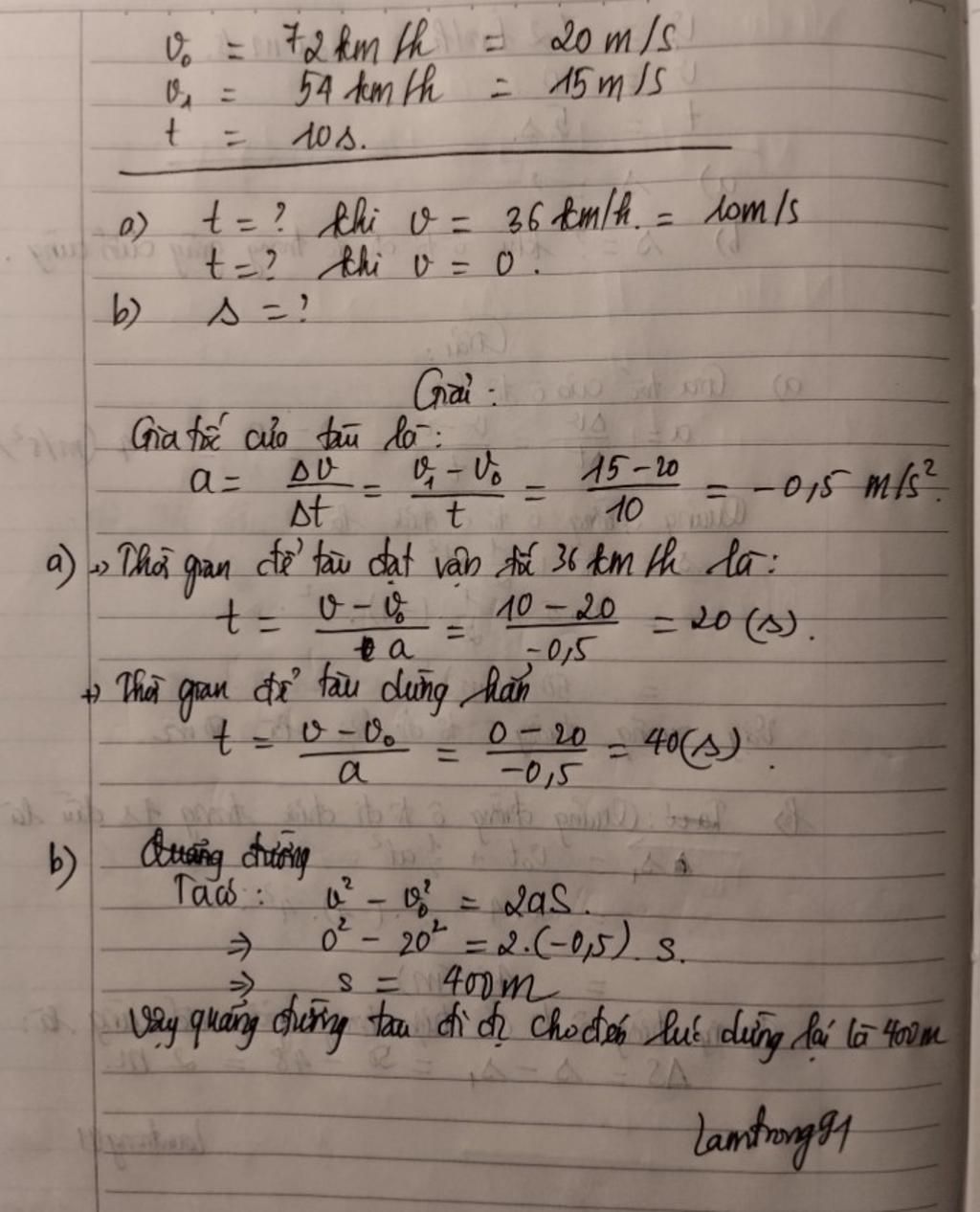 Một đoàn tàu chuyển động với Vo= 72km/h thì hãm phanh chuyển động chậm dần đều, sau 10 giây đạt V1= 54km/h.