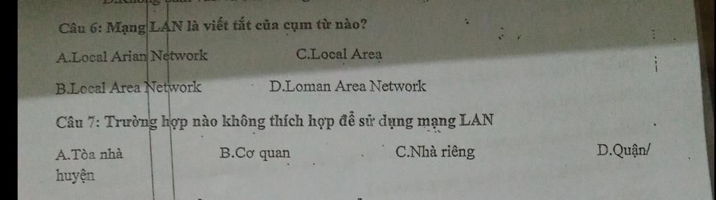 Câu 6: Mạng LAN là viết tắt của cụm từ nào?