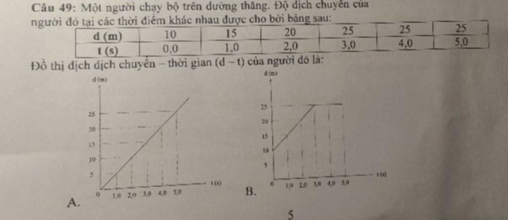 Câu B vì ta dễ dàng nhận thấy từ 3 đến 5 giây vật vẫn không có sự thay đổi của độ dịch chuyển nên vật đứng yên vì vậy có đường thẳng song song với thời gian