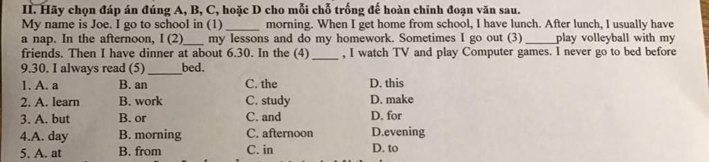Morning là chủ từ chung nên không thể dùng a nên loại câu A cũng như là câu B. Câu này dịch là tôi đi học vào buổi sáng mà sáng nào cũng đi học, không chỉ học sáng nay nên loại câu D. Ta có câu C