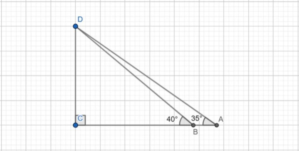 $\to BC\tan\widehat{CBD}=AC\tan\widehat{CAD}\\\to BC\tan\widehat{CBD}=(AB+BC)\tan\widehat{CAD}\\\to BC\tan\widehat{CBD}=AB\tan\widehat{CAD}+BC\tan\widehat{CAD}\\\to BC(\tan40^o-\tan35^o)=15\tan35^o\\\to BC=\dfrac{15\tan35^o}{\tan40^o-\tan35^o}\\\to DC=BC\tan\widehat{CBD}\\=\dfrac{15\tan35^o}{\tan40^o-\tan35^o}.\tan40≈63,45(m)$