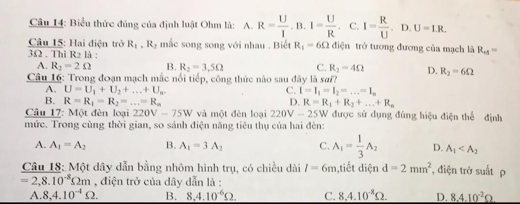 Câu 16: Trong đoạn mạch mắc nối tiếp, công thức nào