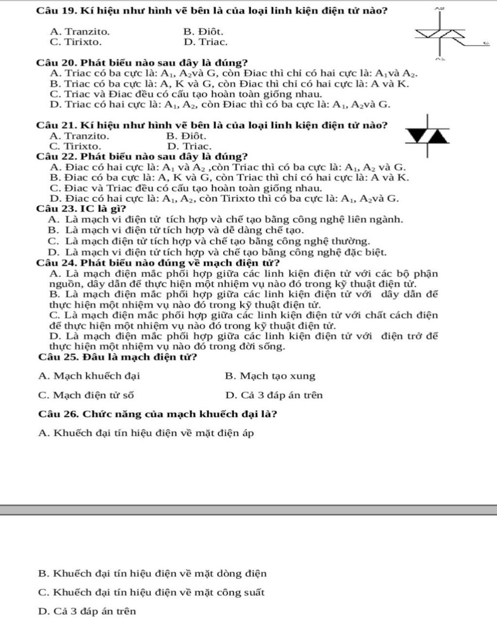 B. Triac có ba cực là: A, K và G, còn Điac thì chỉ có hai cự ...