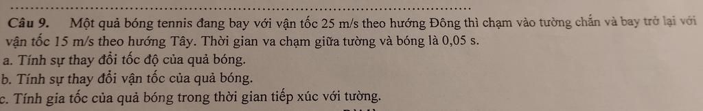 Câu 9. Một quả bóng tennis đang bay với vận tốc 25 m/s theo hướng Đông thì chạm vào tường chắn và bay trở lại với