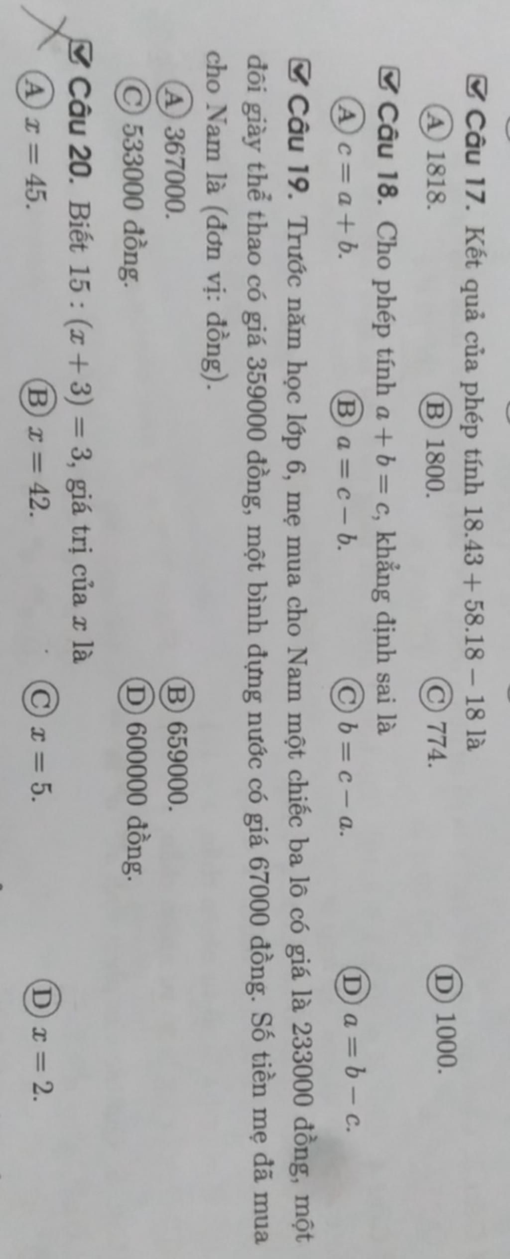 Câu 19: Tổng số tiền mẹ mua cặp, giày và bình nước cho Nam là: