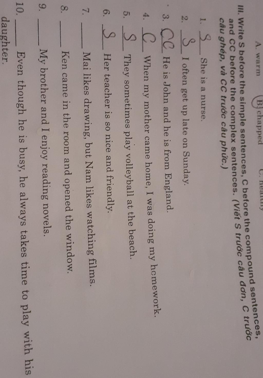 and CC before the complex sentences. (Viết S trước câu đơn, C trước