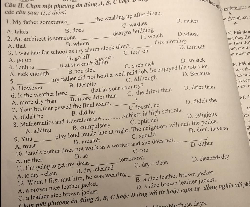 10. D Đồng tình ở thể phủ định dùng neither hoặc either: