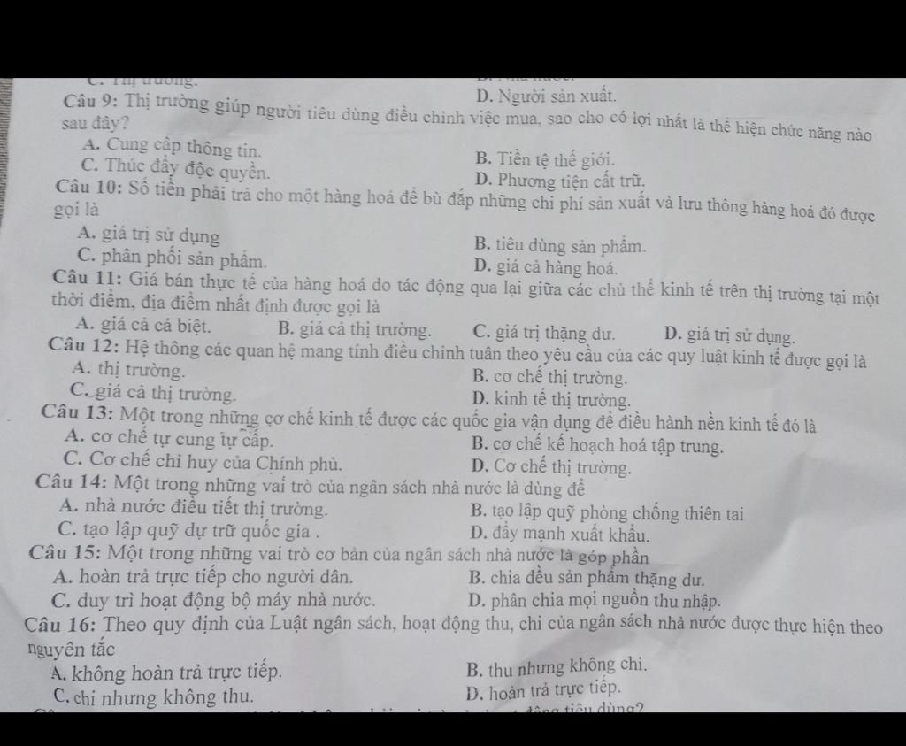 Câu 9: Thị trường giúp người tiêu dùng điều chỉnh việc mua, sao cho có lợi nhất là thể hiện chức năng nào