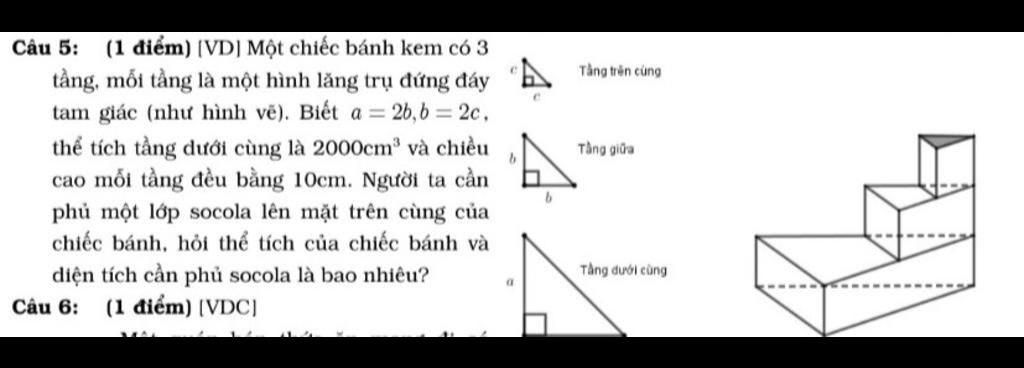Một chiếc bánh kem có 3 tầng, mỗi tầng là một hình lăng trụ đứng đáy tam giác (như hình vẽ). Biết a = 2b,b=2c, thể tích tầng dưới cùng là 2000cm* và chiều cao mỗi tầng đều bằng 10cm. Người ta cần phủ một lớp socola lên mặt trên cùng của chiếc bánh, hỏi thể tích của chiếc bánh và diện tích cần phủ socola là bao nhiêu?