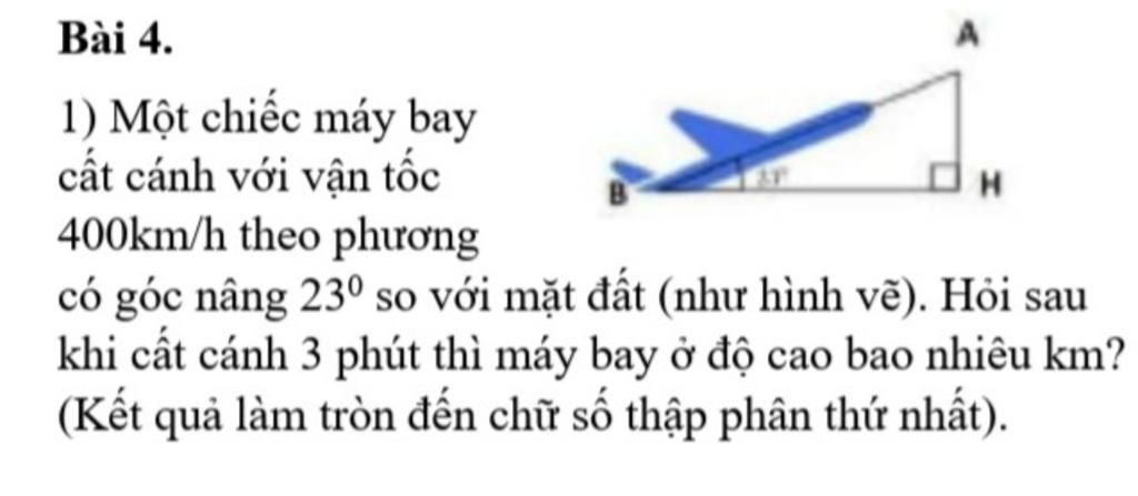 `h = AH = AB . sin 23^o = 20 . sin 23^o ≈ 7,8 (km)`