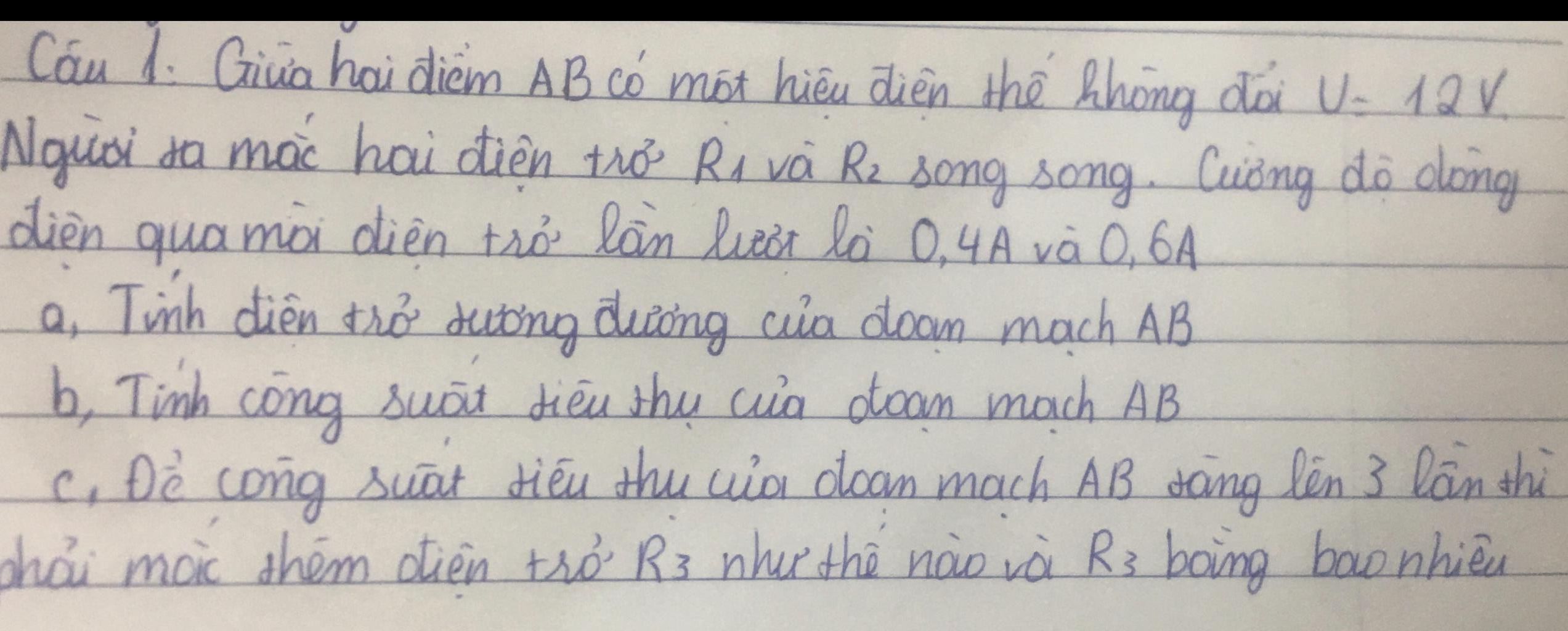 Do vậy ta phải mắc thêm điện trở $R_3$ song song với đoạn mạch trên. Lúc đó ta có:
