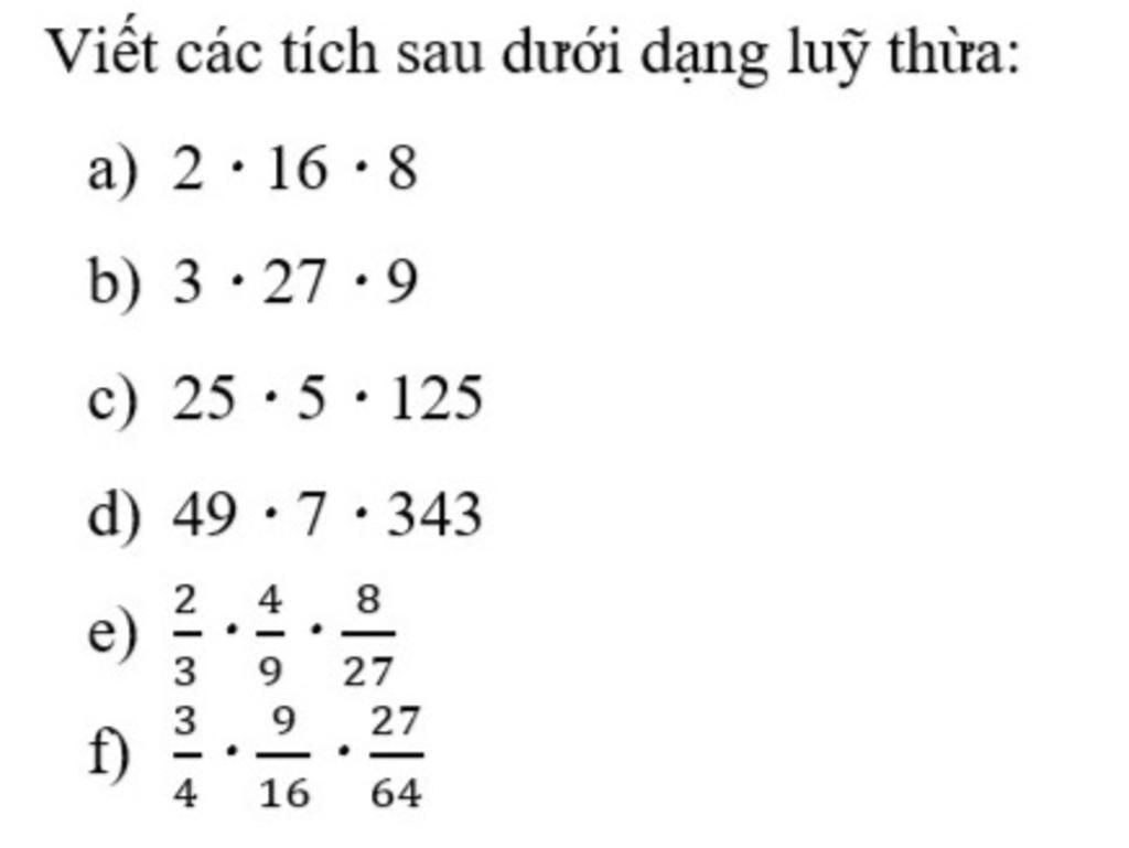 `f) 3/4 . 9/16 . 27/64 = (3/4)^1 . (3/4)^2 . (3/4)^3 = (3/4)^6`