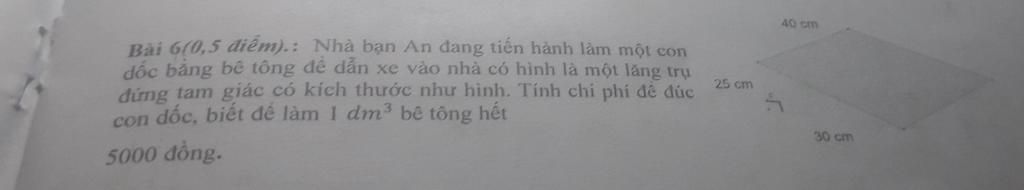 Nhà bạn An đang tiến hành làm một con dốc bằng bê tông để dẩn xe vào nhà có hình là một lăng trụ đứng tam giác có kích thước như hình tính chi phí để đúc con dốc biết để làm 1dm khối bê tông hết 5000 đồng