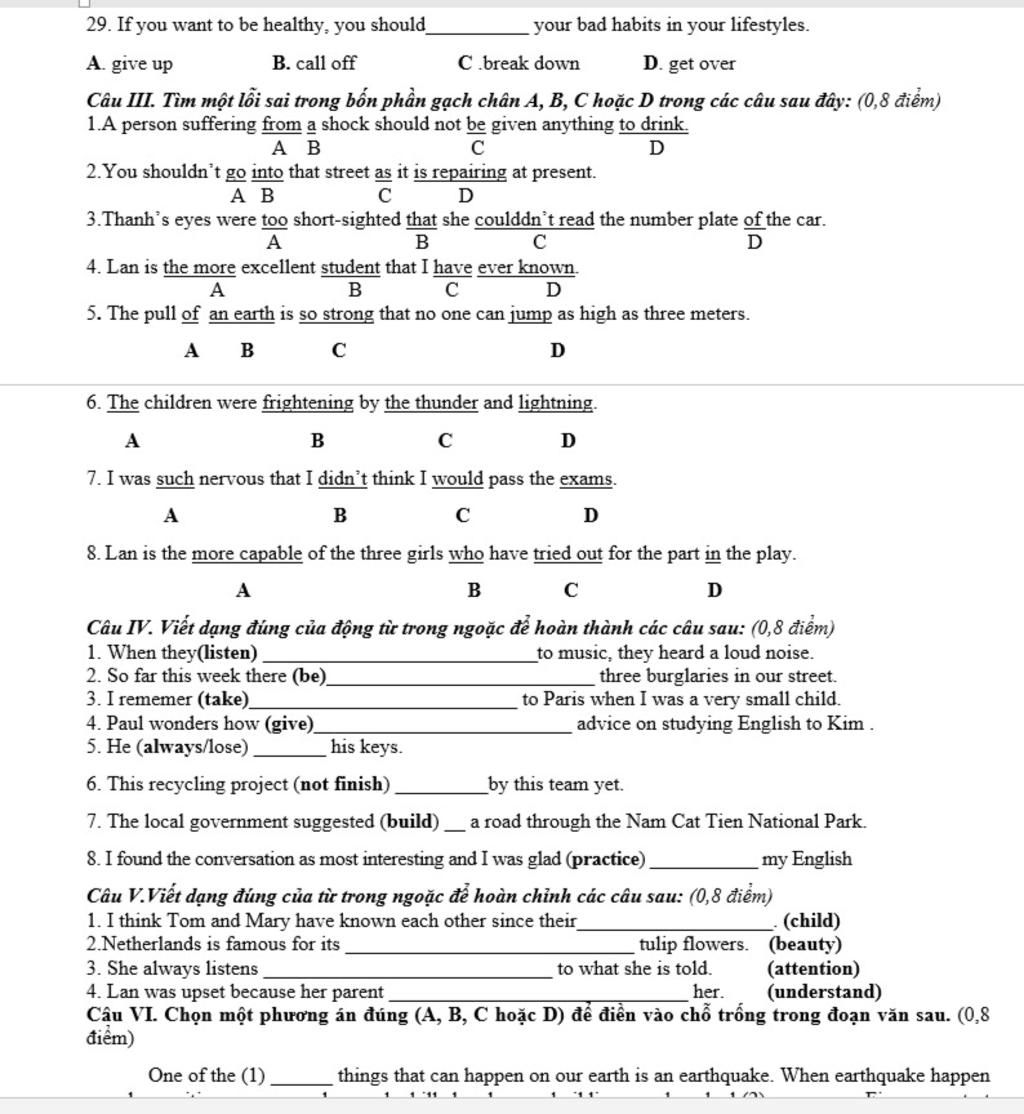 Câu III. Tìm một lỗi sai trong bốn phần gạch chân A, B, C hoặc D trong các câu sau đây: (0,8 điểm)