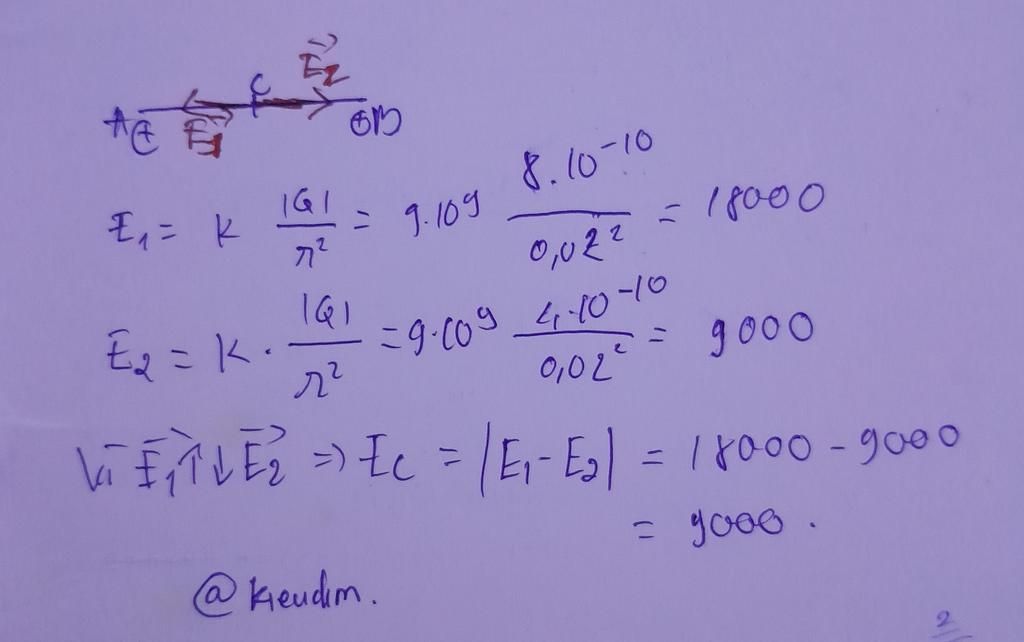 `\vec{E_A}=k.{|q_1|}/{AC^2} = 9.10^9 . {|8.10^{-10}|}/{0,02^2}=18000`
