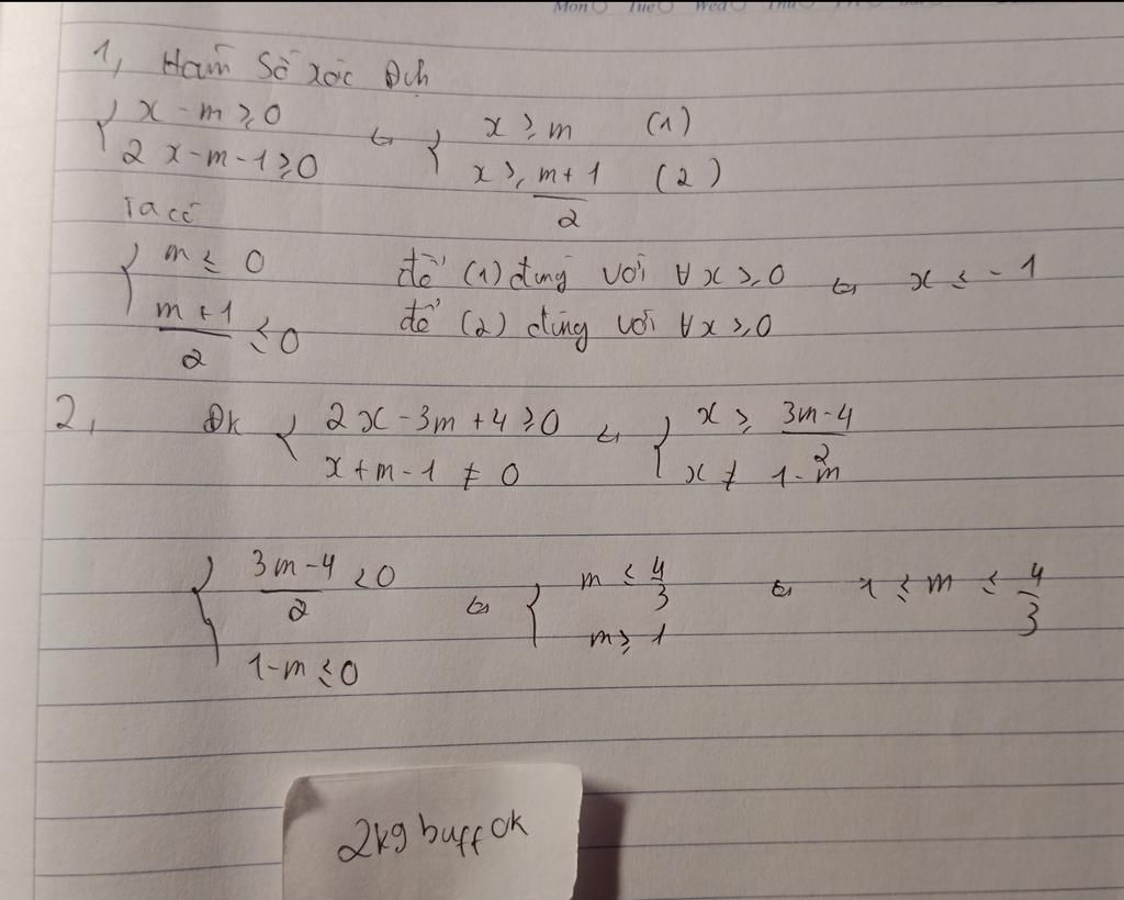 $\Rightarrow \left\{\begin{array}{l} 2x-3m+4 \ge 0 \ \forall \ x >0\\x+m-1 \ne 0 \ \forall \ x >0\end{array} \right.\\ \Rightarrow \left\{\begin{array}{l} x\ge \dfrac{3m-4}{2} \ \forall \ x >0\\x \ne 1-m \ \forall \ x >0\end{array} \right.\\ \Rightarrow \left\{\begin{array}{l} 0\ge \dfrac{3m-4}{2} \\\ 1-m \le 0 \end{array} \right.\\ \Rightarrow \left\{\begin{array}{l} 3m-4 \le 0 \\\ m \ge 1 \end{array} \right.\\ \Rightarrow \left\{\begin{array}{l} m \le \dfrac{4}{3} \\\ m \ge 1 \end{array} \right.\\ \Rightarrow 1 \le m \le \dfrac{4}{3}.$