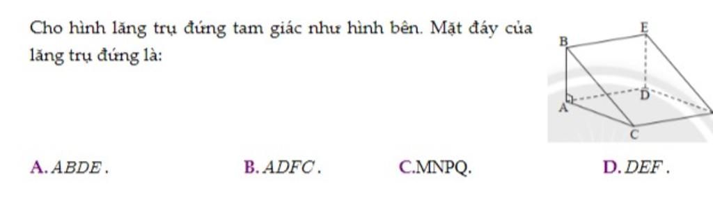 Hình lăng trụ đứng tam giác có mặt đáy là hình tam giác. Mà mặt DEF là hình tam giác nên đó là mặt đáy của hình lăng trụ đứng tam giác ABC.DEF.