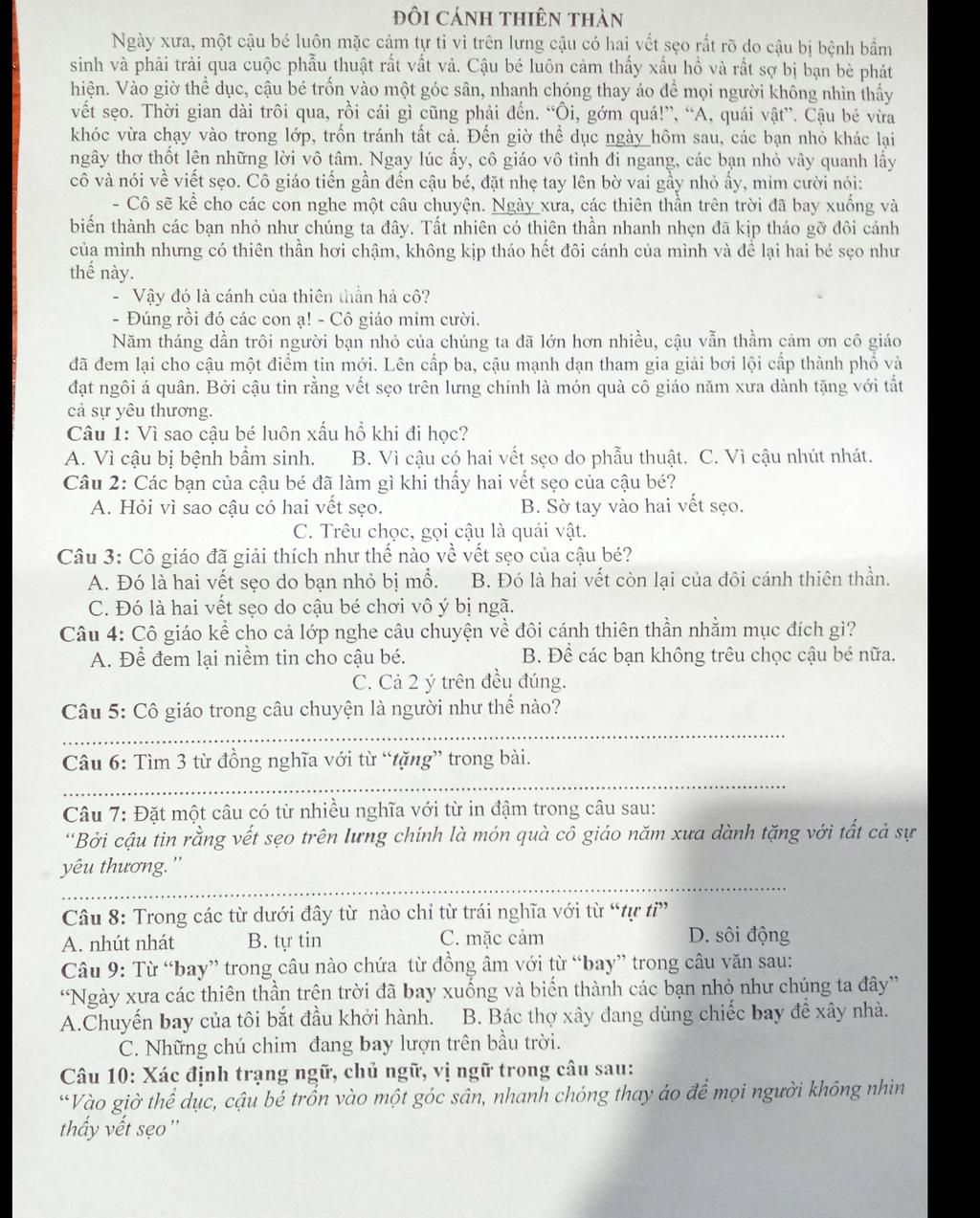 ⇒Trong bài có "Cô sẽ kể cho các con nghe một câu chuyện. Ngày xưa, các thiên thần trên trời đã bay xuống và biến thành các bạn nhỏ như chúng ta đây. Tất nhiên có thiên thần nhanh nhẹn đã kịp tháo gỡ đôi cánh của mình nhưng cũng có thiên thần hơi chậm, không kịp tháo hết đôi cánh của mình và để lại hai vết như thế này."