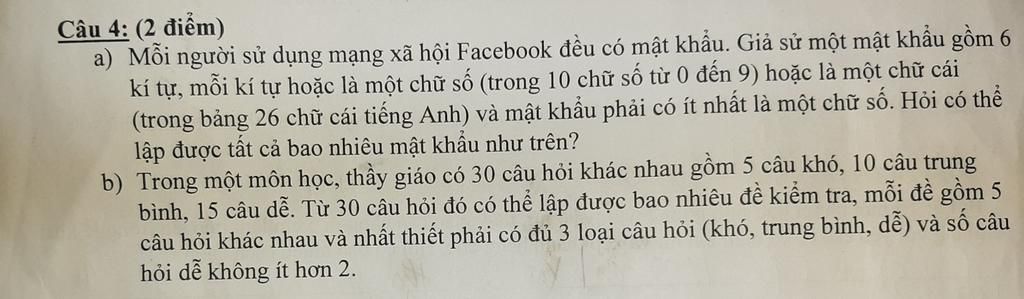 a) Mỗi người sử dụng mạng xã hội Facebook đều có mật khẩu. Giả sử một mật khẩu gồm 6