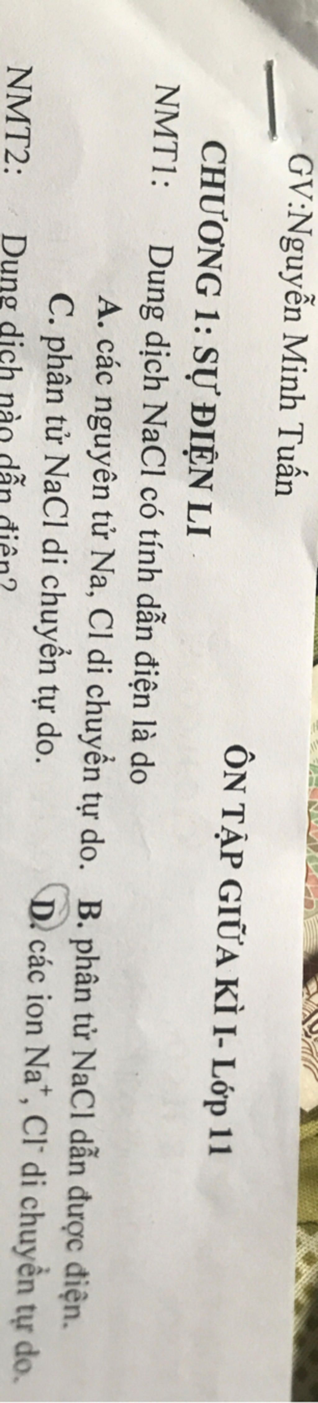 $→$ Dung dịch NaCl dẫn điện được vì NaCl phân ly thành các ion Na+ và Cl- di chuyển tự do.