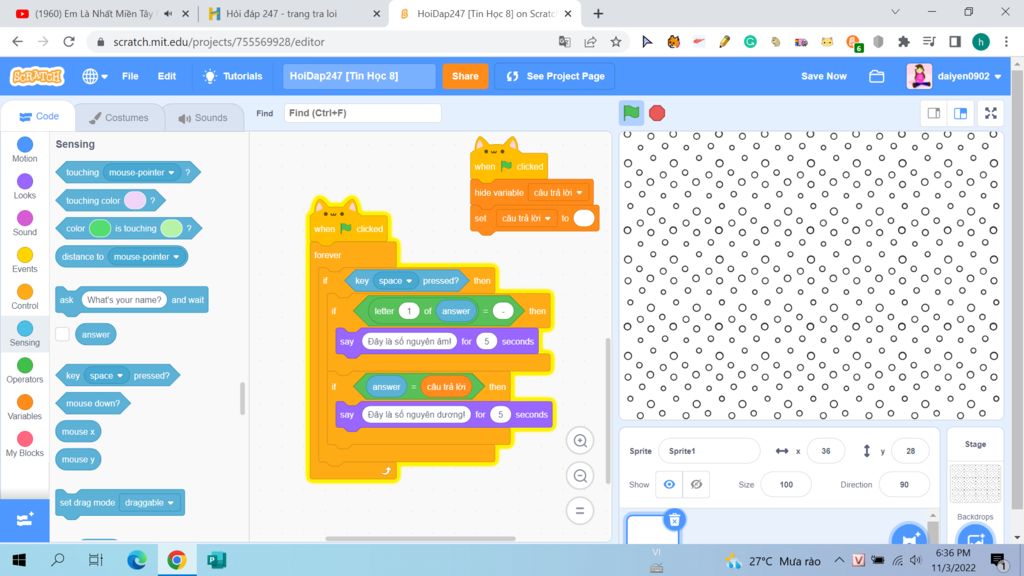 Khi người dùng chương trình Scratch đã trả lời hãy nói họ bấm nút 'cách' để nó hoạt động nha!