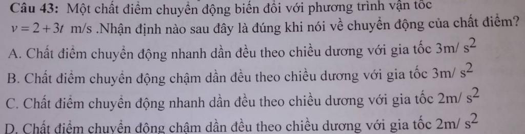 Chất điểm chuyển động nhanh dần đều theo chiều dương với gia tốc $3(m/s^2)$
