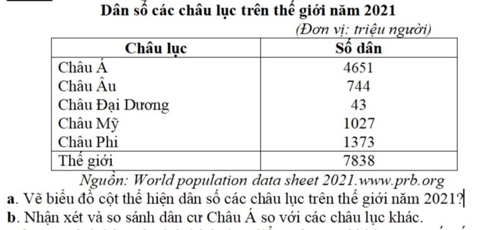 a. Vẽ biểu đồ cột thể hiện dân số các châu lục trên thế giới năm 2021? ...