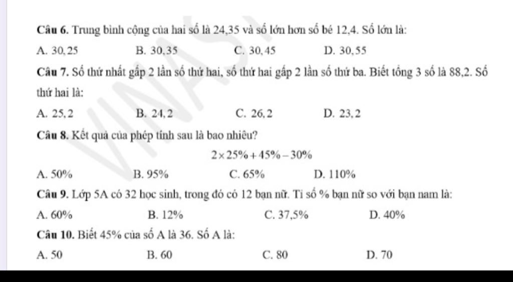 Câu 6. Trung bình cộng của hai số là 24,35 và số lớn hơn số bé 12,4. Sổ lớn là:
