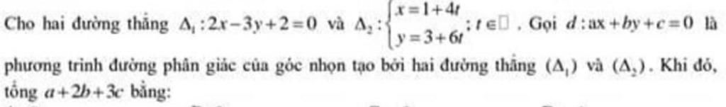 Phương trình đường phân giác góc tạo bởi $Δ_{1}$ và $Δ_{2}$:
