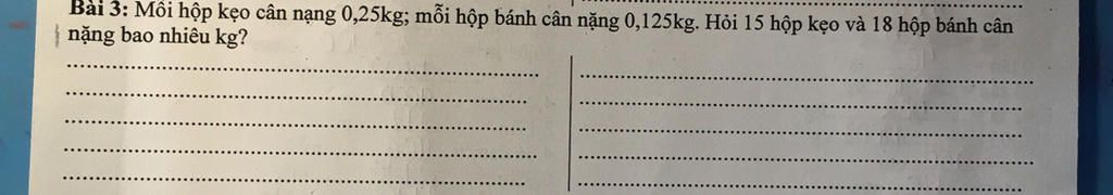 `15` hộp kẹo và `18` hộp bánh cân nặng số `kg` là: