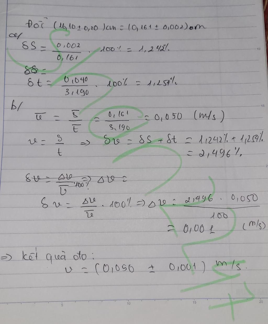 một khoảng thời gian t. Kết quả đo là s = (16,10 ± 0,20)cm và t = (3,19 ± 0,04) s.