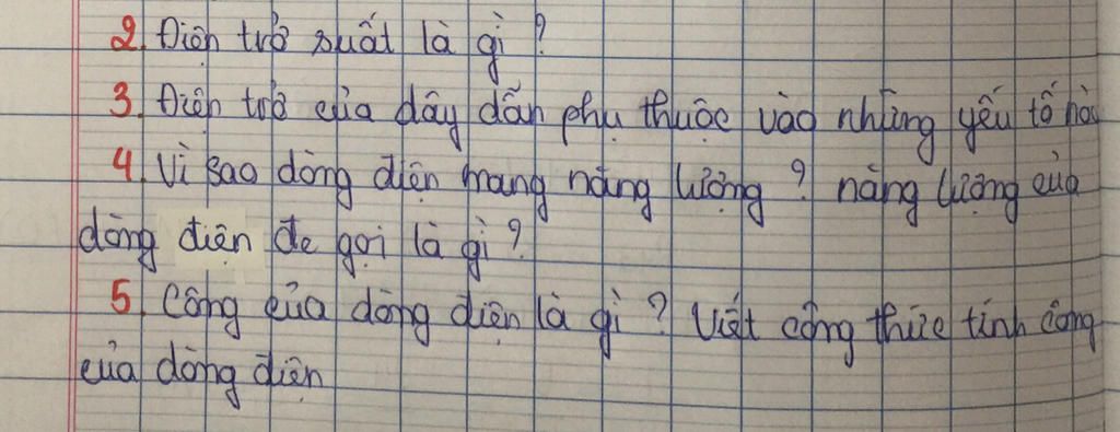 `3.` Điện trở của dây dẫn phụ thuộc vào các yếu tố : chiều dài dây dẫn, tiết diện dây dẫn, vật liệu làm dây dẫn.