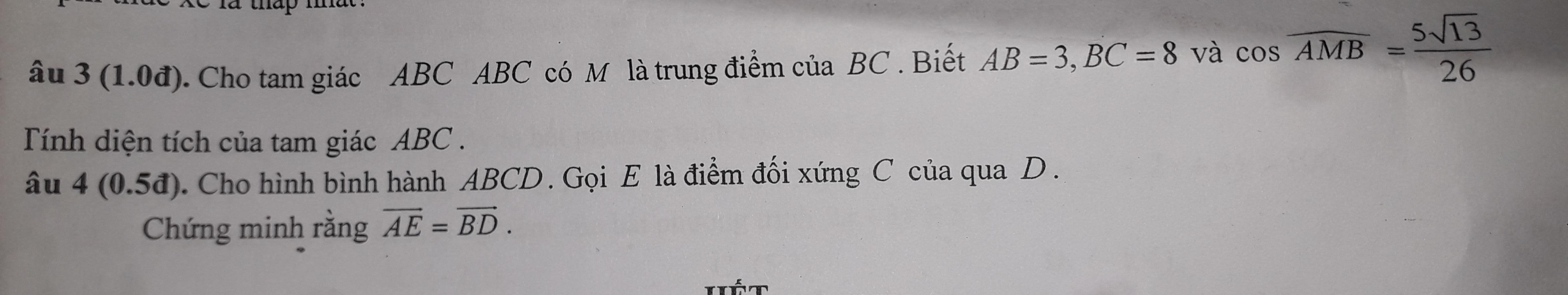 âu 3 (1.0đ). Cho tam giác ABC ABC có M là trung điểm của BC . Biết AB =3, BC =8 và cos AMB