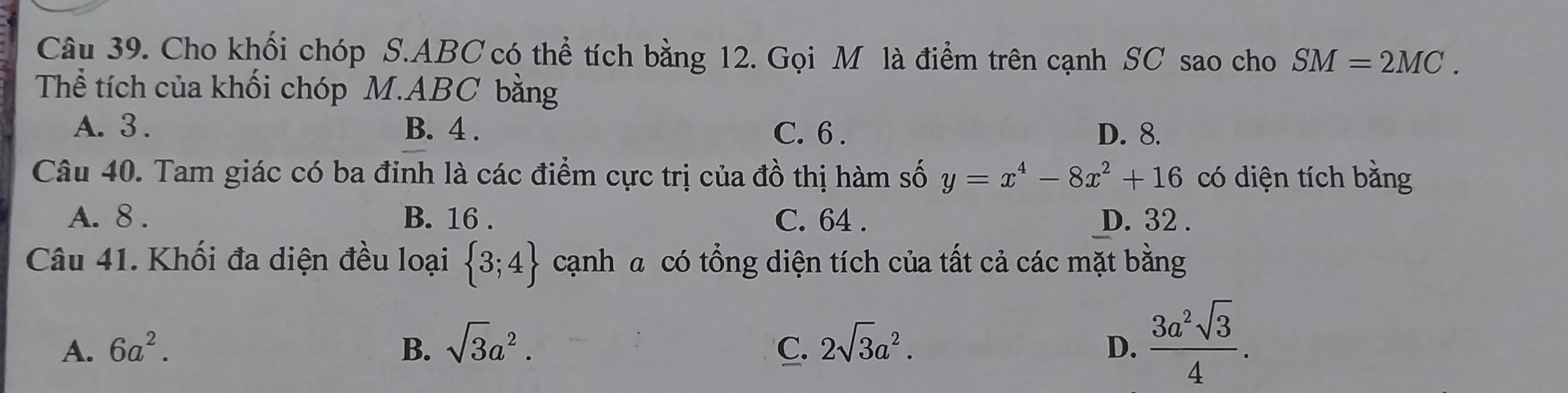 Câu 39: Vì $SM=2MC\Rightarrow \dfrac{SM}{SC}=\dfrac{1}{3}$