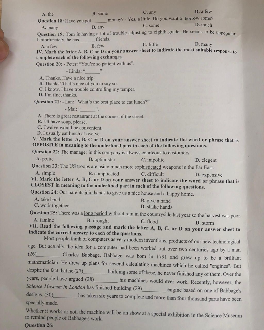 Question 19: Tom is having a lot of trouble adjusting to eighth grade. He seems to be unpopular.