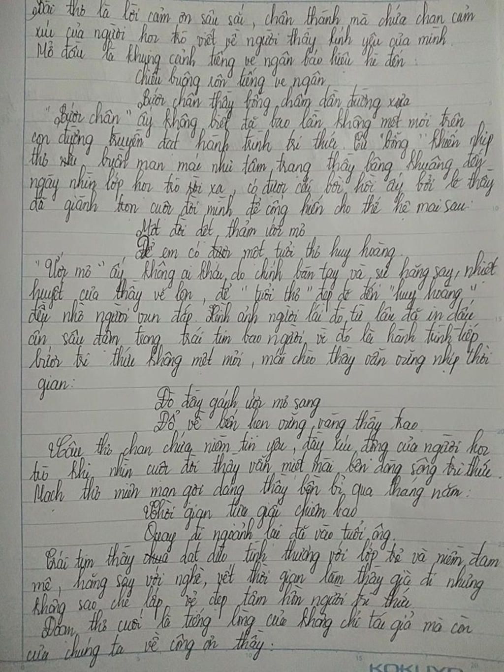 Mỗi tiết dạy của cô luôn chứa đựng những điều hấp dẫn và thú vị. Từ một đứa rất khó chịu với Văn học em trở nên thích thú và luôn chờ đợi mỗi tiết dạy của cô. Chính cô là người đã truyền lửa đam mê học Văn cho em. Nhìn cách dạy, cách truyền đạt trong mỗi lời thơ, câu chuyện, em cảm nhận được sức trẻ và sự nhiệt huyết của cô. Cô luôn bảo với lớp rằng: "Văn học là nhân học, mỗi bài văn luôn chứa đựng những giá trị và bài học trong cuộc sống". Với những người đồng nghiệp của mình, cô luôn hoà đồng và giúp đỡ mọi người, sự thân thiện ấy khiến các thầy cô trong trường đều bị chinh phục và yêu thương cô nhiều hơn.