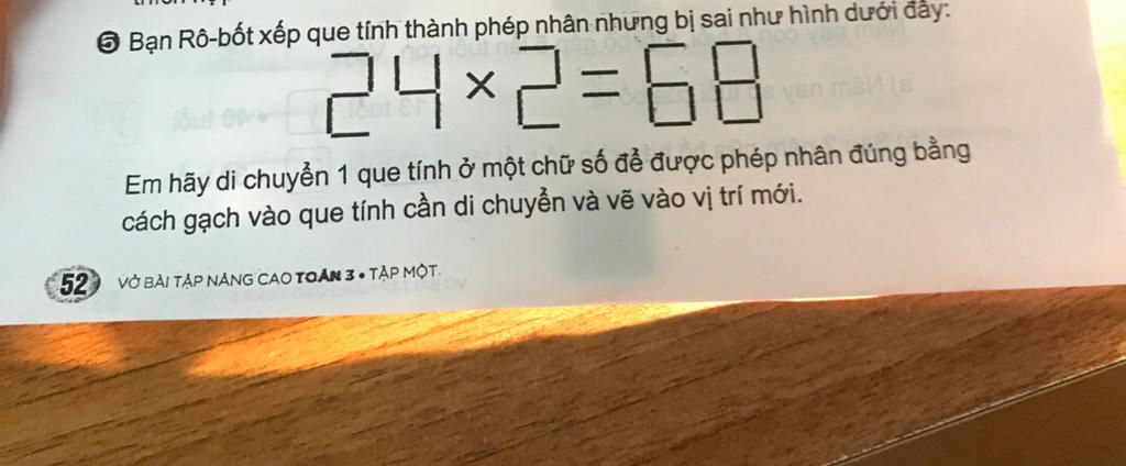 Em hãy di chuyển 1 que tính ở một chữ số để được phép nhân đúng bằng