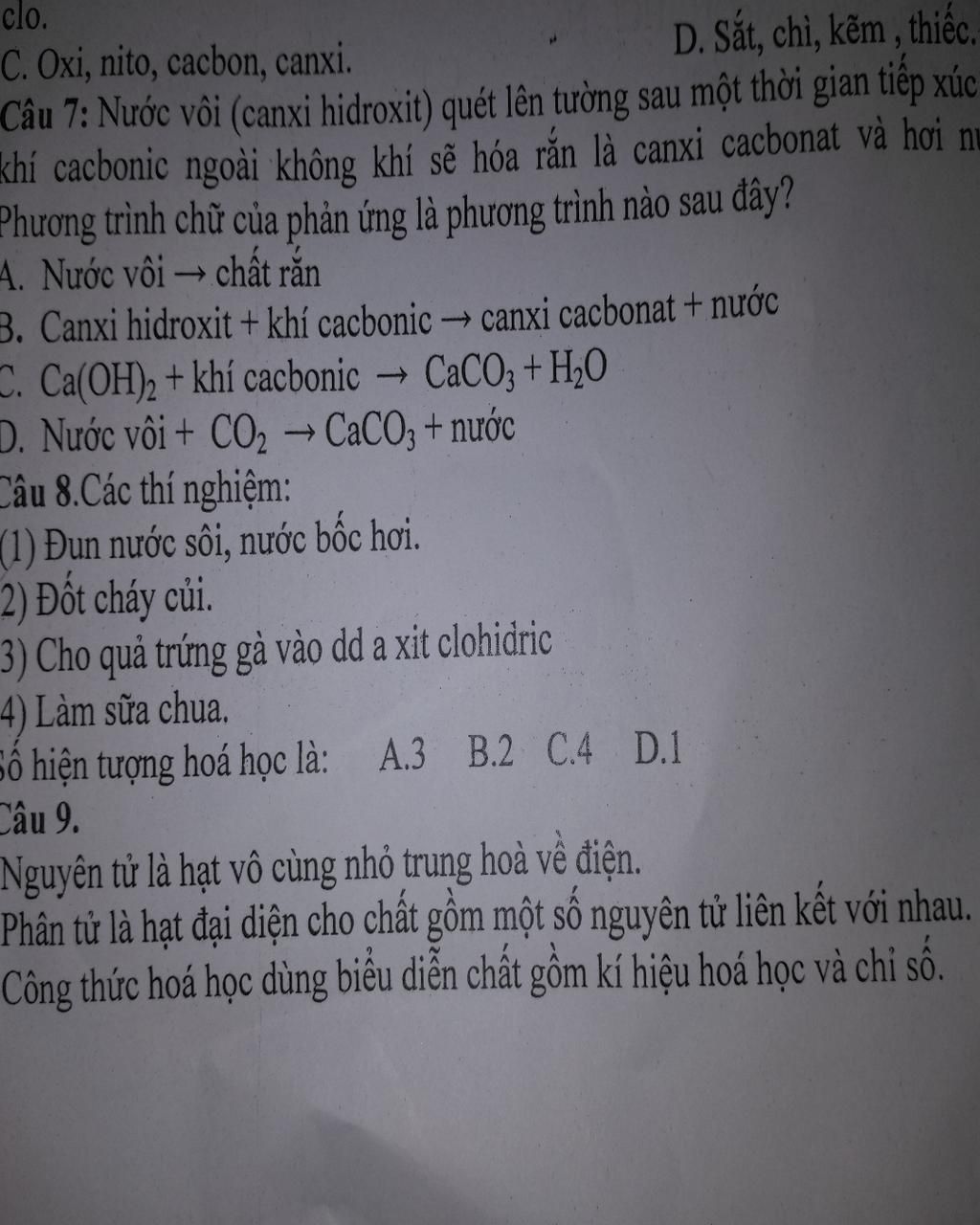 Câu 7: Nước vôi (canxi hidroxit) quét lên tường sau một thời gian tiếp xúc