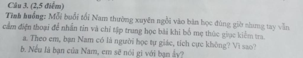 a. Theo em Bạn Nam không có tính tự giác, tích cực vì khi ngồi học bạn không lo học mà chỉ mãi mê nhắn tin, như vậy việc học chỉ xem như là làm cho có, chỉ là làm đối phó. Bạn chỉ tập trung vào học bài khi phải để bố mẹ thúc giục kiểm tra, như vậy là bạn Nam đang thiếu trung thực trong học tập, không có tính tự giác, phải đợi bố mẹ thúc giục