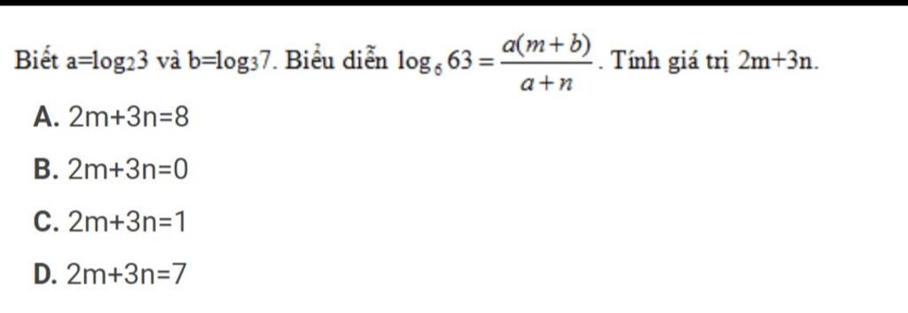 {\log _6}63 = {\log _6}\left( {9.7} \right) = {\log _6}9 + {\log _6}7\\