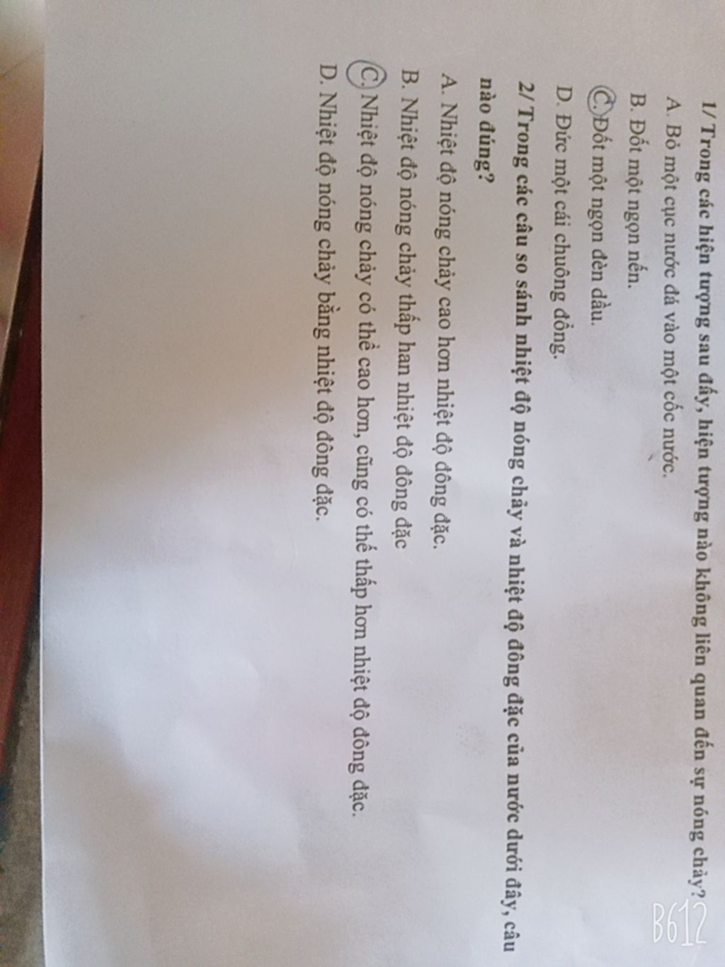 2/ Trong các câu so sánh nhiệt độ nóng chảy và nhiệt độ đông đặc của nước dưới đây, câu