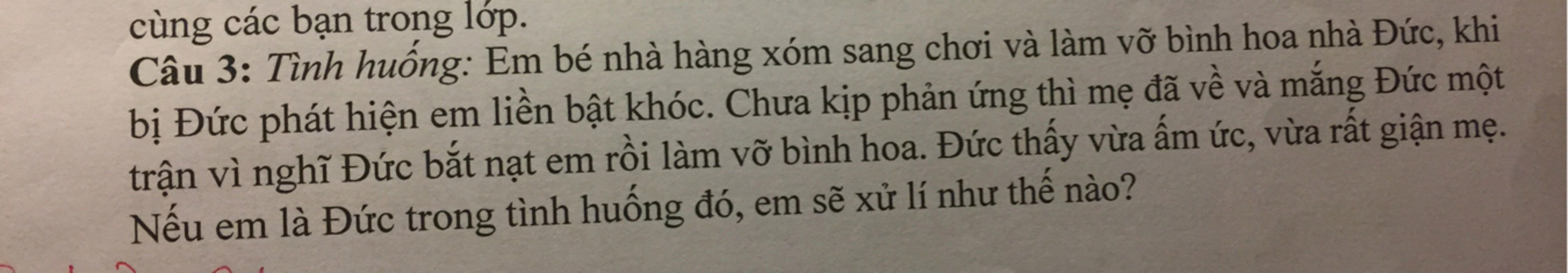 Câu 3: Tình huống: Em bé nhà hàng xóm sang chơi và làm vỡ bình hoa nhà Đức, khi