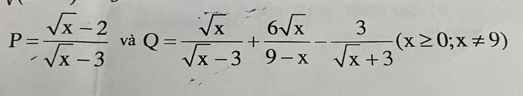 `A=P.Q=(\sqrt{x}-2)/(\sqrt{x}-3).(\sqrt{x}-3)/(\sqrt{x}+3)`