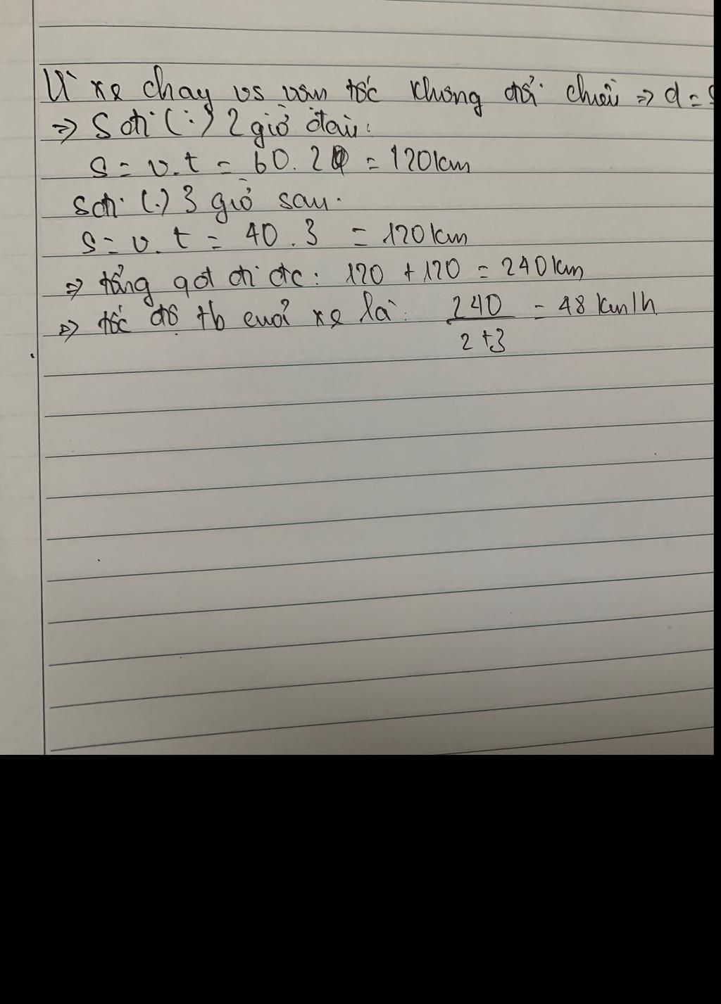 $v_{tb}=$ $\frac{s_1+s_2}{t_1+t_2}=$ $\frac{120+120}{2+3}=48(km/h)$