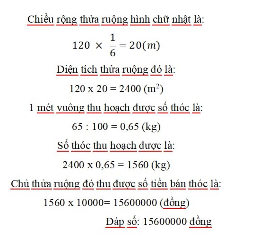 Số tiền chủ thửa ruộng đó thu hoạch được là:
