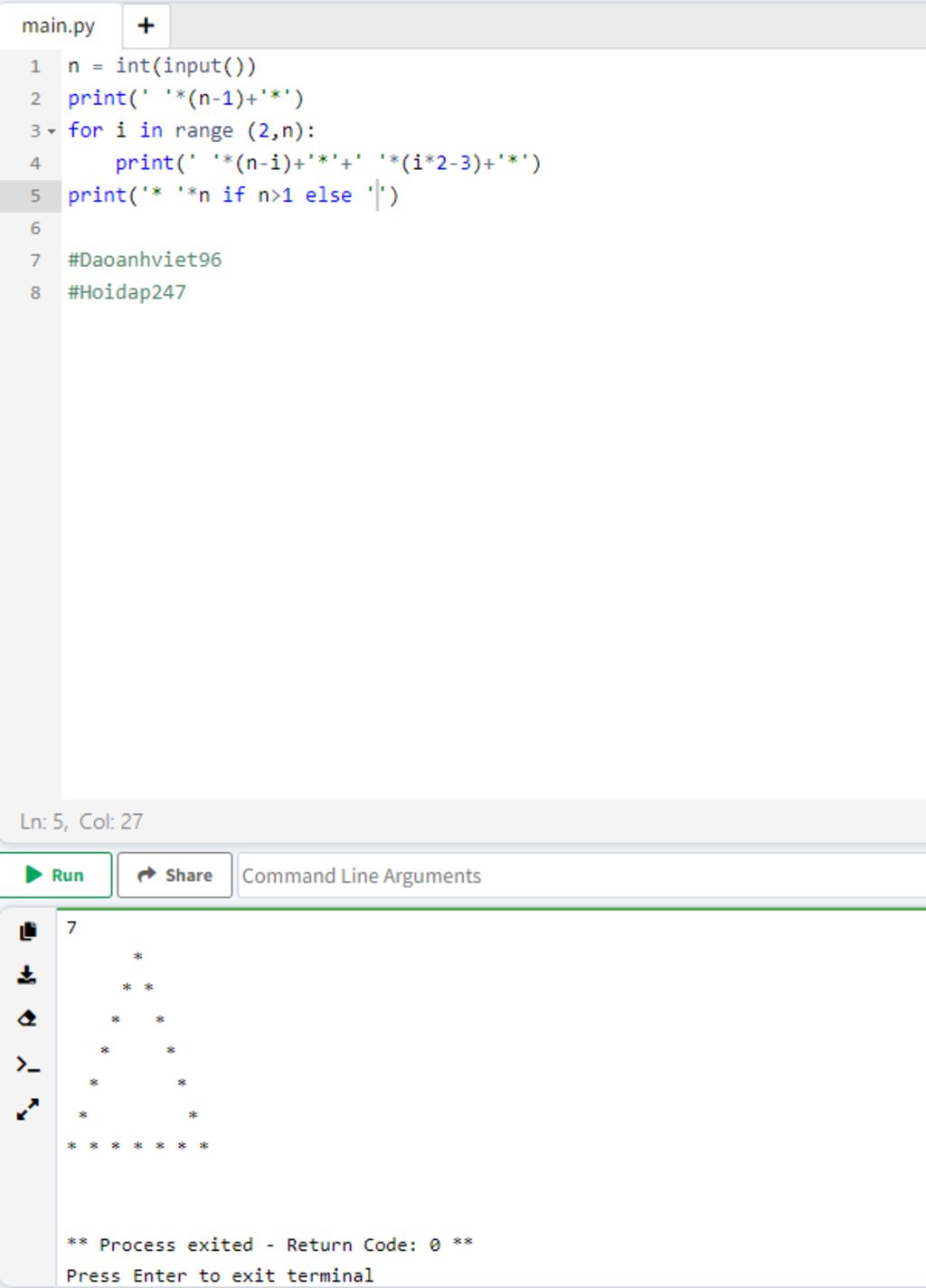 print(' '*(n-i)+'*'+' '*(i*2-3)+'*')