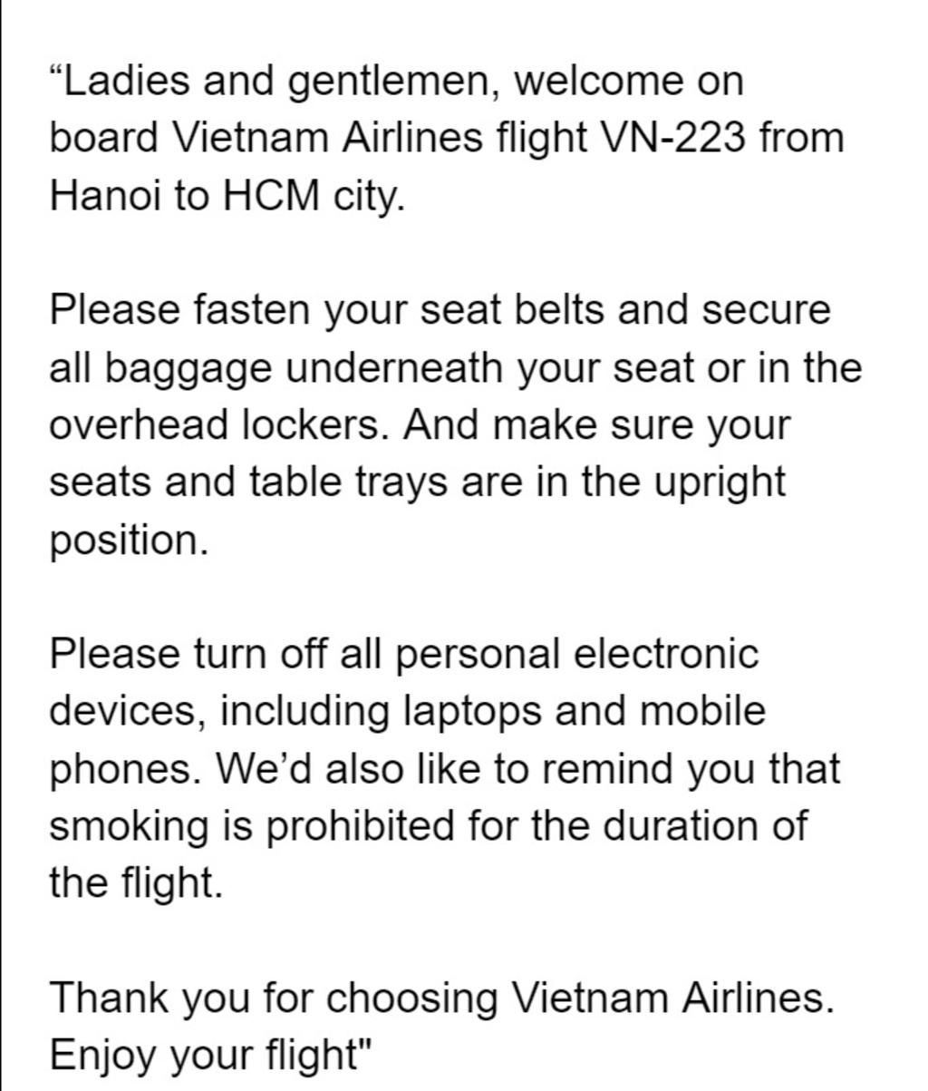 "Kính chào quý khách, chào mừng quý khách đã lên chuyến bay VN-223 Vietnam Airlines từ Hà Nội đến thành phố Hồ Chí Minh.